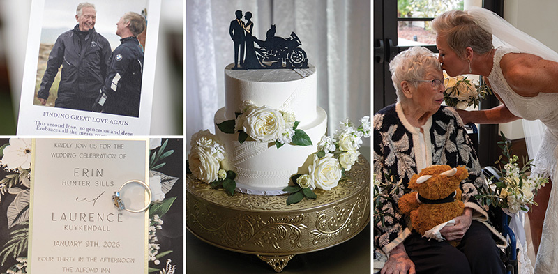 Laurence and Erin own seven bikes between them—so they’re no weekend warriors; they’re motorcycle racing industry icons. Although they could have gotten married anywhere, Erin has family in Central Florida—including her 90-year-old mother, for whom she wanted the ceremony to be accessible. Says Erin: “She had a great time; we even decorated her wheelchair.”