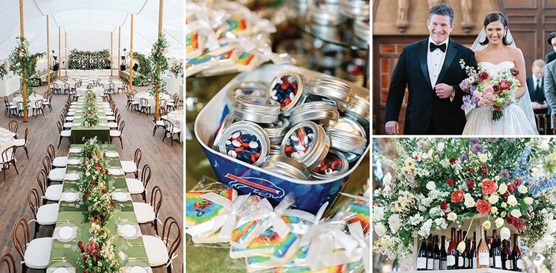 Collateral material—including signage—sported hand-drawn maps of the city’s landmarks and images of the couple’s beloved special-needs pet, Floyd (a French bulldog). The rehearsal dinner featured nods to Buffalo with an abundance of those oversized foam fingers saluting the NFL’s Bills.