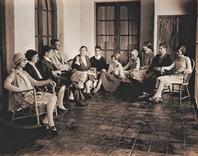 Harris (above center), despite her worsening health, returned to Rollins at Holt’s behest during the winter semester of 1929–30 to speak at the Animated Magazine—her topic this time was “Man, the Most Evil of all Lower Animals”—and to teach a course on the nature of evil. Holt even gave Harris a title, “Professor of Evil,” and saw to it that newspapers around the world received press releases. No one else in the photograph is identified. But that’s Hugh McKean—an art professor and a future president of the college—seated third from the left. The Rollins College Department of Archives and Special Collections